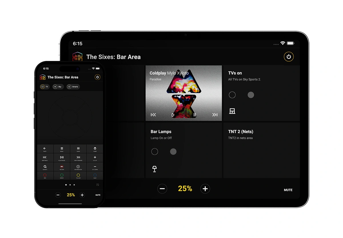 Create custom scenes like “Open Up”, “Match Day”, or “Closing Time” that instantly set TVs, lighting, and music to the right channels and volume with one button. Automate routines or schedule them to run exactly when you need.